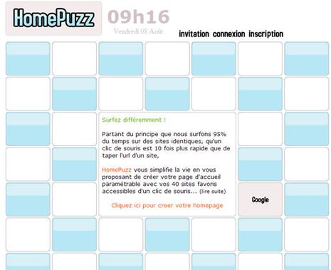 Partant du principe que nous surfons 95% du temps sur des sites identiques, qu’un clic de souris est dix fois plus rapide que de taper l’URL d’un site, HomePuzz vous simplifie la vie en vous proposant de créer votre page d’accueil paramétrable avec vos 40 sites favoris accessibles d’un clic de souris… Tout est dit, excellente et bien pratique cette idée de site Web 2.0