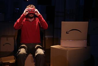 L’image de cet homme assis sur un carton avec ce drôle d’objet dans les mains, qui lui fait des yeux d’extraterrestre et évoque ce jouet pour enfants, entre appareil photo et kaléidoscope, qui permet à celui qui l’utilise de visualiser des images, m’a d’abord intriguée. Dans ce décor de cartons Amazon qui tirent la gueule, posés à l’envers tout autour de lui, quelque chose se passe. Suffisamment en tout cas pour me donner envie de retourner à la Piccola Scala, un an et demi après avoir découvert la salle avec la jolie Perte.