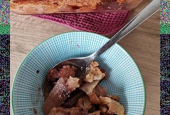 Je vous avais déjà parlé de la poire de terre ici dans un gratin dauphinois. Ce légume peut être consommé cru ou cuit, en salé ou en sucré! Dans mon dernier panier de légumes, il y en avait une grosse, une bonne occasion de la tester en sucré. J'ai choisi le crumble en l'associant aux pommes avec une note de cerise. C'est très bon! La poire de terre doit être précuite avant car elle est assez dure.