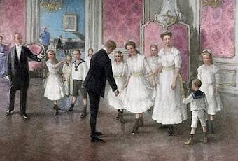 [DE] Fasching 1909: Tanzunterricht der Enkel bzw. Urenkeln des Kaisers im Schloss Schönbrunn geleitete von Professor Eduard Van Hamme. Es handelt sich um Kinder der Erzherzogin Maria Valerie und der Gräfin Seefried. (Genauer Figurenschlüssel vorhanden). Der Kaiser beobachtet den Unterricht vom Nebenzimmer. Farbige Heliogravüre nach Aquarell von Gustav August Hessl. Aus Mappe: "Zweite Folge zu Viribus Unitis. Das Buch vom Kaiser. Franz Joseph I., 80 neue Bilder aus dem Leben unseres Kaisers, Herausgegeben von Max Herzig", [1910]. [FR] Carnaval 1909 : cours de danse des petits-enfants ou arrière-petits-enfants de l'empereur au château de Schönbrunn, dirigé par le professeur Eduard Van Hamme. Il s'agit des enfants de l'archiduchesse Marie Valérie et de la comtesse Seefried. (Clé de figurine précise disponible). L'empereur observe la leçon depuis la pièce voisine. Héliogravure en couleur d'après une aquarelle de Gustav August Hessl. Extrait du portfolio : Zweite Folge zu Viribus Unitis. Das Buch vom Kaiser. Franz Joseph I., 80 neue Bilder aus dem Leben unseres Kaisers,édité par Max Herzig, 1910.