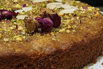 Commencez par préparer le sirop qui doit être froid au moment de son utilisation.Mettez le sucre et l'eau dans une casserole. Mélangez. Ajoutez la tranche de citron.Posez sur feu moyen et menez à ébullition. Laissez bouillonner 10 à 15 min, le temps que le sirop commence légèrement à épaissir. Otez du feu. Parfumez à l'eau de roses. Laissez refroidir.Mettez les fruits secs et la chapelure dans un récipient. Ajoutez la levure chimique. Mélangez.Mélangez bien l'ensemble.Versez la pâte dans le moule bien beurré. Enfournez dans un four préchauffé à 180°C.Laissez cuire une 20aine de minutes. Une pointe enfoncée dans le gâteau doit ressortir sèche.Posez le moule sur une grille. Arrosez de tout le sirop. Laissez refroidir sans toucher.Décorez de fruits secs concassés ou d'amandes effilées.PREPARATION :