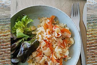 - Cuire le riz selon les instructions de préparation du paquet puis l'égoutter et le réserver.