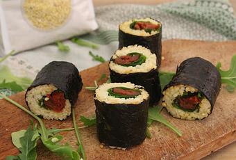 Placer le millet dans une casserole avec deux fois son volume d'eau salée. Couvrir, porter à ébullition et laisser cuire une quinzaine de minutes. Couper le feu et laisser reposer. Arroser de vinaigre de riz et bien mélanger.Couper les tomates séchées en lamelles. Laver et essuyer la roquette. Préparer les makis : sur chaque feuille, étaler la moitié du millet encore tiède sur toute la surface, en laissant environ 3 cm de libre. Disposer la roquette sur le bas de la feuille et dessus les pétales de tomates confites. Rouler bien serrer, et laisser reposer quelques minutes, le temps que l'algue s'assouplisse. Couper chaque rouleau en six avec un couteau bien tranchant. Servir nature ou avec une petite sauce composée de vinaigre balsamique + huile