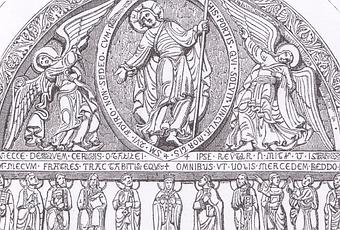 La symétrie du linteau permettait au dévot, sur le seuil, de méditer sur le Christ passant la porte de Jérusalem et sur les Elus, à qui s’ouvre la porte du Ciel, identifiée à celle d’un Temple [7]. Commune aux deux scènes et à la fonction même du linteau, l’idée de porte est à comprendre au sens du psaume 118,20 :