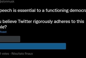 Le 25 mars dernier, Musk lançait en effet sur Twitter un sondage sous forme d’une question simple : « La liberté d’expression est essentielle à une démocratie qui marche. Pensez-vous que Twitter adhère rigoureusement à ce principe ? »