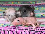 Porthos, à trois semaines, avec sa grosse tête de nounours, accompagné de ses deux frères Athos -devant- et Aramis -à gauche-. Actuellement Aramis et Athos, que j’appelle mon Tichose, vivent chez moi. Aramis est un superbe mâle nu de caractère dominant, en excellente santé, très doux avec les humains, sera le futur reproducteur de cette lignée issue de Maître Yoda. Athos, le plus faible de cette portée, avait failli mourir à l’âge de huit jours après que sa mère l’eut abandonné. Il est resté petit, mais sa santé est bonne, même si actuellement un petit rhume fait roucouler ses poumons.