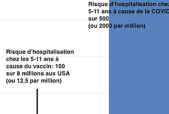 Autrement dit, des effets secondaires sérieux ont été rapportés dans 2,4% des 4249 rapports d'effets secondaires, soit une centaine de cas sur 8 millions de doses. En comparaison, rappelons ce qui a été dit plus haut: dans le cas de la COVID, l'INSPQ estime qu'un enfant infecté sur 500 se retrouve à l'hôpital. Ce qui voudrait dire que le ratio d'hospitalisation à cause de la COVID serait plus de 150 fois plus élevé.