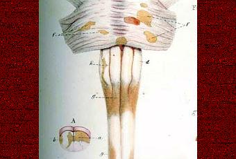 Sclérose en plaques. Illustration des premières lésions mises en évidence au niveau de la moelle épinière par Cruveilhier et Carswell. Les lésions sont à la fois présentes dans les matières blanche et grise, apparaissant sur l’image comme de petites taches brunes.