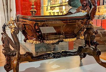Ce berceau était destiné à des occasions officielles et prestigieuses et a donc été conçu avec somptuosité. Il s'agit d'un cadeau de la Ville impériale et résidentielle de Vienne à la Maison impériale à l'occasion de la naissance du prince héritier Rudolf le 21 août 1858, d'où les armoiries viennoises sur le devant. Le berceau ornemental richement décoré provient de l'atelier de l'ébéniste viennois Franz Matthias Podany (1819-92). Il présente des formes de style néo-rococo typiques de l'époque et comporte comme ornementation sculpturale un aigle double couronné qui, portant sur sa poitrine les armoiries généalogiques des nobles maisons de Habsbourg-Lorraine et de Wittelsbach, symbolise également les liens qui unissent ces dynasties.Les mosaïques en bois qui décorent le cadre et le corps du lit sont particulièrement remarquables. La même année, 1858, lorsque Podany a fabriqué le berceau du prince héritier, il a également déposé un brevet pour son procédé spécial ("Technique Podany") permettant de réaliser des placages en mosaïque de ce type à petite échelle.