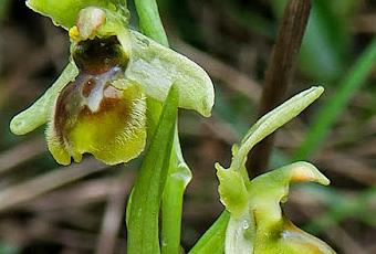 Ophrys virescens, Ophrys araneola (Ophrys litigieux) : tige verte ; feuilles inférieures en rosette, les supérieures lancéolées engainantes : bractées foliacées ; inflorescence lâche ; fleurs assez petites, sépales verdâtres étalés, pétales vert-jaunâtre à bords parfois ondulés, labelle ovale, entier, brun-rouge bordé d'un liseré jaune, gibbosités peu marquées, macule gris-bleuté souvent en forme de H.