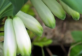 Polygonatum odoratum (Sceau de Salomon odorant) : herbacée vivace, tige anguleuse ; feuilles ovales alternes ; fleurs blanches pendantes groupées par 1-2 ; baies vertes puis bleu noirâtre.