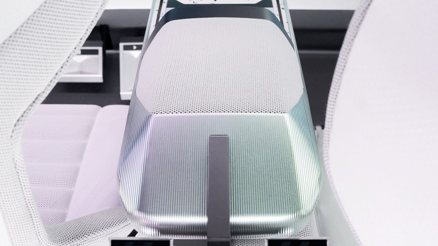 Les tissus sont développés sans pigment, qui sont souvent un des obstacles au recyclage, en plus d’être polluants. D’où l’esthétique très blanche, que l’on retrouve de plus en plus dans les gammes des entreprises qui souhaitent bannir les pigments (cf. la gamme Forclaz sans pigment de Decathlon). Et les contraintes apportent souvent leur lot de belles idées ! C’est ainsi uniquement par la lumière que vient la couleur. Le tableau de bord utilise la réfraction de la lumière sur le plexiglas holographique pour apporter une atmosphère intérieure qui décuple les sensations que l’on connaît aujourd’hui avec l’éclairage d’ambiance.