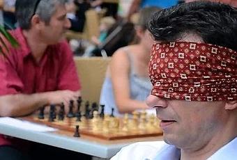 Le grand maître international Eric Prié réalisait une démonstration de parties simultanées à l’aveugle sur 4 échiquiers - Photo © Les Cavaliers du Val d'Allier