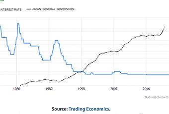 Figure 1 : Japon : Taux d’intérêt directeur et dette publique en pourcentage du PIB