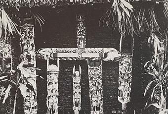 Photo 1 : Cabane de présentation des sculptures pour la cérémonie Malaggan, circa 1910 © Rautenstrauch-Joest-Museum, Cologne in Kunst und Kultur aus der Südsee, Köln, 1987.