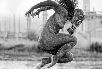 Une femme nue, recouverte de boue, bondit, tel un animal en fuite, jambes repliées, bras en arrière, comme sa chevelure frisée.
