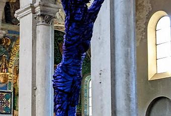 [FR] La statue du Christ en bois de l'artiste Harry Seeholzer est accrochée dans le choeur de l'église Saint-Maximilien à Munich. Elle mesure sept mètres de long, pèse environ 500 kilos et est d'un bleu éclatant.