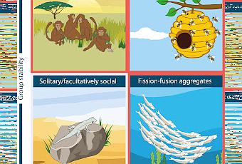 Une catégorisation générale des systèmes sociaux basée sur la taille et la stabilité du groupe, des espèces principalement solitaires qui interagissent occasionnellement avec des congénères (par exemple, pendant la saison de reproduction), aux groupes de reproduction coopératifs et aux sociétés eusociales. Bien que les espèces soient souvent classées comme vivant en groupe ou non, il existe une grande variation entre les espèces sociales dans la tendance à être sociale (par exemple, socialité facultative par rapport à socialité obligatoire), la taille typique des groupes, la stabilité de l'appartenance au groupe dans le temps, jusqu'à quel point les individus ont des rôles cohérents au sein des groupes, et la relation entre les individus au sein d'un groupe. Ces variables peuvent différer entre les populations d'une même espèce et les tendances sociales peuvent différer entre les individus d'une même population. La région ombrée en rouge représente les systèmes sociaux où un comportement collectif peut émerger. Notez que la complexité sociale peut également être organisée en fonction d'autres attributs de groupe, notamment la parenté et le biais de reproduction.