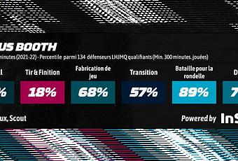 Bien qu’il puisse sauter sur la contre-attaque si l’opportunité se présente, Booth prend peu de risques offensifs. Il distribue bien la rondelle sur le cycle et prend de bonnes décisions. De l’autre côté, son tir, son contrôle de rondelle et ses instincts offensifs s’avèrent plutôt modestes.