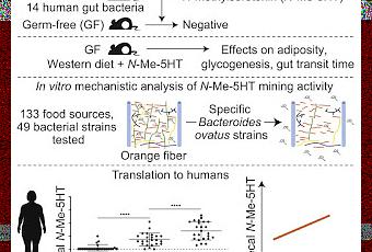 Les fibres végétales dans les flux de sous-produits élaborés par des méthodes de transformation des aliments mous représentent des bio-dépôts de biomolécules diverses, naturelles et physiologiquement actives. Pour démontrer une approche pour leur caractérisation, la spectrométrie de masse du contenu intestinal de souris gnotobiotiques, ainsi que des études in vitro, ont révélé la libération de N-méthylsérotonine à partir de fibres orange par des membres du microbiote intestinal humain, y compris Bacteroides ovatus. Des analyses génomiques fonctionnelles de souches de B. ovatus cultivées dans des conditions permissives et non permissives d'extraction de la N-méthylsérotonine ont révélé des loci d'utilisation des polysaccharides qui ciblent les pectines dont l'expression est corrélée à la libération spécifique de la souche de ce composé. La N-méthylsérotonine, administrée par voie orale à des souris sans germes, réduit l'adiposité, modifie la glycogenèse hépatique, raccourcit le temps de transit intestinal et modifie l'expression des gènes qui régulent le rythme circadien dans le foie et le côlon. Dans les études humaines, l'accumulation fécale de N-méthylsérotonine spécifique à la fibre orange et dépendante de la dose était positivement corrélée aux niveaux de gènes du microbiome codant pour les enzymes qui digèrent les glycanes pectiques. L'identification de ce type d'activité minière microbienne a des implications thérapeutiques potentielles. Nathan D. Han, et al, dans Cell, publication en ligne en avant-première, 27 juin 2022