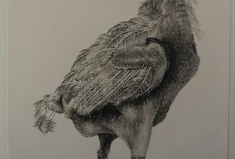 Quand je suis entré, je les ai vues immédiatement : de grandes feuilles sur lesquelles étaient dessinés des animaux (mouche, poulet, souris…), leur taille de géants emplissant l’espace blanc dans lequel chacun est figé. Je choisis de m’en éloigner, intrigué probablement par le gigantisme que souligne à l’extrémité de l’alignement le dessin d’un corps humain plié en deux. Cet alignement m’amène à me poser des questions (sans chercher de réponse) sur ce qui a le plus d’importance et qu’est-ce que l’importance ? À ce moment, une jeune femme passe près des feuilles accrochées sur le mur. Il n’y a plus de silence.