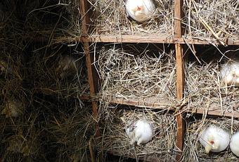 Dans les casiers qui montent le long du mur de l’escalier au fond de la grande salle du rez-de-chaussée, d’étranges formes sortent de la paille, comme d’autant de nids. Sortir du nid, c’est le titre de cette installation. Ce qui sort, on ne sait pas bien ce que c’est : des oisillons ? mais ils auraient un drôle de bec ; des tétons ? mais de quelle poitrine ? Personne ne nous dira ce que c’est. Laissons donc le mystère sortir du nid et envahir la paroi verticale dans l’odeur de la paille.