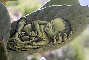 Dans sa série de dessins préférée il a décidé d'utiliser les coussinets de cactus épineux comme toiles pour ses images politiques. A l'acrylique blanc et vert et aux détails impressionnants, compte tenu de sa surface vivante bosselée, il représente des portraits de deux nouveau-nés, l'un se reposant dans les bras de sa mère tandis que l'autre l'allaite. D'une vieille femme en keffieh, les yeux fermés et le front plissé, serrant un passe-partout. Il ne représente pas de couteaux, l'arme la plus utilisée dans l'infitada actuelle, ni d'autres armes.