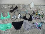 Depuis quelques années, j'ai un peu réduit le nombre de mes maillots "courants". D'abord, il y a mon maillot Eres vintage, qui doit avoir plus de 20 ans, et qui est bien sûr impeccable. Deux-pièces shorty, il est tout à fait dans le ton de leur collection de l'année dernière, vous vous souvenez, des couleurs flashy bordées de blanc. Je le mets de temps en temps, après tout c'est une pièce d'exception ! Ensuite il y a mon maillot Speedo à l'imprimé arty, que je mets surtout pour faire de la voile ou du stand-up paddle. Pourtant, c'est un de ceux qui me va le mieux. J'ai aussi un maillot H&M sur lequel j'avais flashé il y a 2 ans dans un magazine, mais le haut est un poil trop petit et la culotte largement trop grande. En fait, il n'y en a que 3 ou 4 que je mets régulièrement en ce moment. Le principe est simple, j'ai un bas de maillot noir simplissime Princesse Tam-tam, que je mets avec plusieurs hauts : son triangle noir coordonné, un bandeau marron Galeries Lafayette, un triangle Kaleïdoscope Jenna de Rosnay (dont la culotte est trop grande, ouais je sais j'abuse, mais j'aime pas être serrée dans mes maillots, et après ils lâchent), et un triangle noir et blanc graphique Tex de Carrefour (une grosse surprise : acheté il y a 5 ans et beaucoup porté, sa culotte noire vient à peine de me lâcher). Cet été, je n'ai acheté qu'un maillot, pendant les soldes, chez Princesse Tam-tam (c'est un peu cher certes, mais ils font des choses sympas, avec une qualité acceptable). Je n'ai d'abord acheté que le bas (ben oui si vous avez bien suivi, j'ai un petit surplus de hauts), gris, très chic avec son revers et son gros noeud. Ma gentille Maman m'a ensuite acheté le haut, une coupe un peu bandeau mais à nouer derrière le cou, avec son joli noeud au milieu (il n'est pas sur la photo, il m'attendait sagement en Corse). Le bas gris va donc très bien avec le triangle noir ou le bandeau marron, et pour twister un peu le côté chic, il s'accorde aussi avec le Jenna kaleïdoscope (une merveille ce maillot, comme tous les maillots Jenna d'ailleurs). Photo de famille :