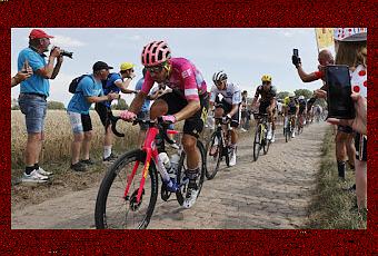 Depuis un moment, six courageux brossés par la poussière (Powless, Gougeard, Boasson Hagen, Van Der Hoorn, Clarke, Cort Nielsen) ouvraient la voie comme pour conjurer le mauvais sort, l’âme tôt bleuie par le manque d’air. Tout s’emballa en nervosité, à la faveur d’une partie de gros bras, frottages en règle des plus puissantes équipes pour projeter au mieux leurs cadors (Ineos, Jumbo, Quick-Step, FDJ, Bora, UAE, DSM, etc.). Avant même la furie des goulets d’étranglement, le maillot jaune Wout van Aert (Jumbo) tâta méchamment l’asphalte et s’octroya une belle chasse pour reprendre sa place, manquant de peu de percuter un véhicule. Nous pensâmes à Chris Froome, en 2014, contraint à l’abandon dans des circonstances dantesques… sans même apercevoir le début des tronçons pavés de mauvaises intentions.