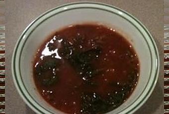 This soup starts with a chicken stock, is made savory with dried herbs, garlic, leeks, and mushrooms, and then finished with a few shredded spinach leaves and grated parmesan. Most of the vegetables are strained out, so it is not really filling enough to