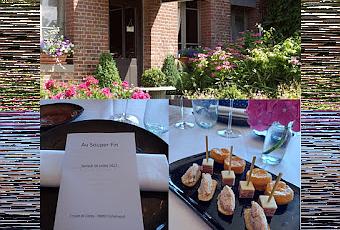 En apéritif, un Champagne Brut Blanc de Noirs, maison Gardet: un blanc de noirs de très belle construction. Nez vif, brioché tendrement, salivant. Bouche avec une acidité soyeuse, une fine pointe d’amers discrets. Minéralité glycérinée tendre. Un champagne d’apéritif sur la finesse et une certaine vinosité. Très Bien ++
