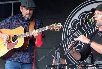 Des fois, ils sont six, ce soir, en piste, uniquement le noyau de base, Topher Loudon ( Dye, et Blah Blah Blah ) , from Belfast, guitare acoustique, chant et casquette, et le Breton Anthony Masselin ( Bagad de Lann-Bihoué , Soldat Louis) aux flûtes de tous formats ( tin whistle ou flûte de 57,5 cm) , uilleann pipes et stomp box, ont pour mission de faire danser le Goëlo.