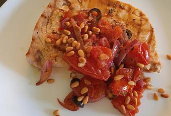 Quand mon invité du mercredi est venu manger à la maison quelques jours plus tard j'ai préparé la même recette en remplaçant l'espadon par du thon albacore que j'ai servi mi-cuit. C'est également délicieux.