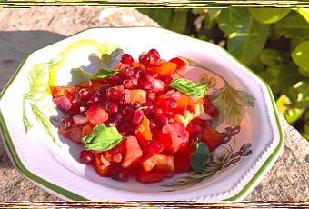 - Disposer les tomates et leur jus sur une grande assiette, répartir les graines de grenade, l'origan et servir avec un filet d'huile d'olive.