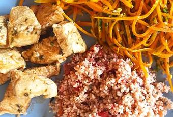 Pour ce midi, ce sera une assiette composée de carottes, poulet et taboulé.