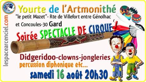 A la Yourte de l’Armonithé, “le petit Mazet” - (Espace Bio), sur la route de Villefort, entre Génolhac et Concoules, soirée Spectacle de Cirque. Didgeridoo, clowns, jongleries, percutions diphonique etc.