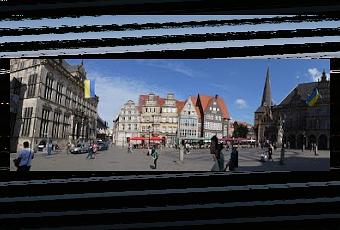 Photo composite d'une partie de la place principale de Bremen - une des plus belles que j'ai pu voir en Europe. (Composite réalisé pendant que des passants déambulaient, d'où leur apparence irréelle ou incomplète). Maisons renaissance et église, puis une partie de l'hôtel de ville.