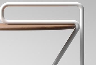 « Just love the appearance like the wooden tabletop bends the metal tube backwards which functions as base support and as a clever transport handle. »