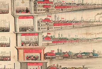 Affiche de la « Naissance des Soviets et des différents organes du pouvoir soviétique », illustrant l’organisation hiérarchique du pouvoir soviétique, v. 1920. Bibliothèque LSE.