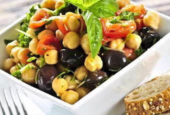 Mélangez les pois chiches avec les herbes, tomates et olives dans un grand saladier - Vous pouvez aussi y ajoutez un filet d'huile d'olive selon votre goût - puis servez-les dans des bols avec des feuilles de basilic.