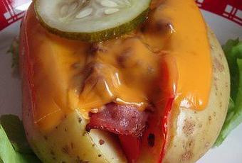 4) Couper les pommes de terre en deux. Les garnir avec des tranches de tomate, une tranche de lard et du hachis