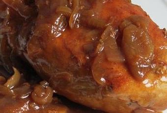 2) Faire fondre une noix de beurre dans une poêle et y faire dorer les filets de poulet et les tranches d'oignon.