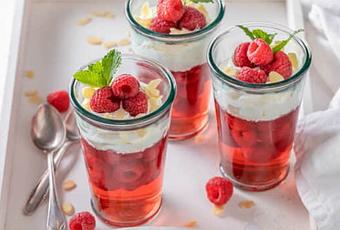 Répartissez votre gelée dans des verres et ajoutez en dessus des framboises - les 100 g restantes - puis mettez au frigo.
