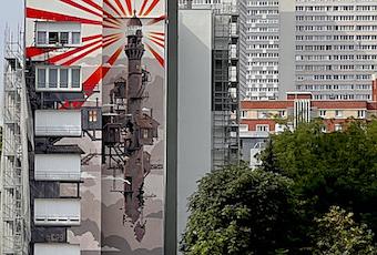 WEN2, artiste formé aux arts appliqués, a exercé pendant un temps une activité professionnelle liée à l’urbanisme et à l’architecture en parallèle de son art. Ses phares sont érigés dans des cités imaginaires aux multiples détails. Cette nouvelle fresque est inspirée du Phare de l’Ile Vierge, situé dans le Finistère et mesurant plus de 80 mètres de haut. Le phare et sa cité flottante se jouent de l’architecture de l’immeuble en intégrant les volumes à la composition de l’œuvre. Le tout semble littéralement mis en lumière.