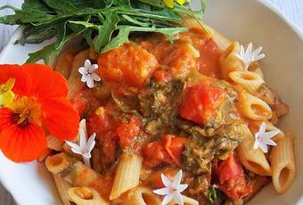 Servez immédiatement avec les pâtes, la roquette et les fleurs.