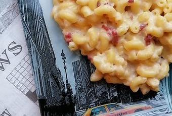 4) Mélanger les pâtes, la sauce au fromage et les lardons et répartir le tout dans un plat