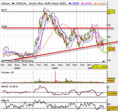 Et pour cause l'action Theolia vient de rompre un canal haussier installé depuis 2003 à la baisse, franchement et avec de forts volumes. L'éolien c'est bien écologiquement parlant mais économiquement parlant ça manque de marge et le marché est arrivé très rapidement à maturité, d'ou un chiffre d'affaires non vigoureux. Le dossier Theolia devient donc ininteressant à jouer à long terme pour le moment, le titre semble bien s'engager dans une phase 4 de weinstein, sensiblement vers le strong support à 10€. Bien sur l'action demeure très volatile et donc très jouable à très court terme pour jouer des rebonds techniques. Mais en dehors de ça, pour le moment nous conseillons les investisseurs de rester à l'écart du dossier et de plutôt miser sur les biotechnologies et notamment NICOX dont nous ferrons une analyse ce jour.