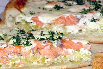 Mettez les poireaux sur la pate puis couvrez avec le saumon fumé coupé en lanières.