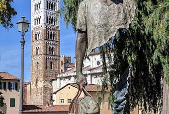 Une combinaison fascinante d'histoire et d'art contemporain. Les "I Viaggiatori - Les Voyageurs" de Bruno Catalano, trois sculptures (Pierre David, J4 et Khadine) qui font le tour du monde et qui ont atterri pour un mois à Lucca, où elles ont en effet placées sur les remparts après avoir passé l'été à Viareggio.