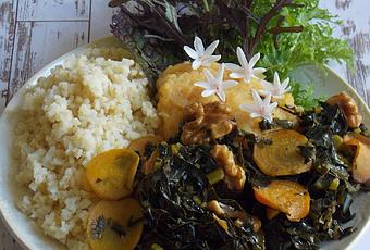 J'ai accompagné le tout de boulgour, de lentilles corail, de salade moutarde japonaise et de fleurs d'ail de l'Himalaya.